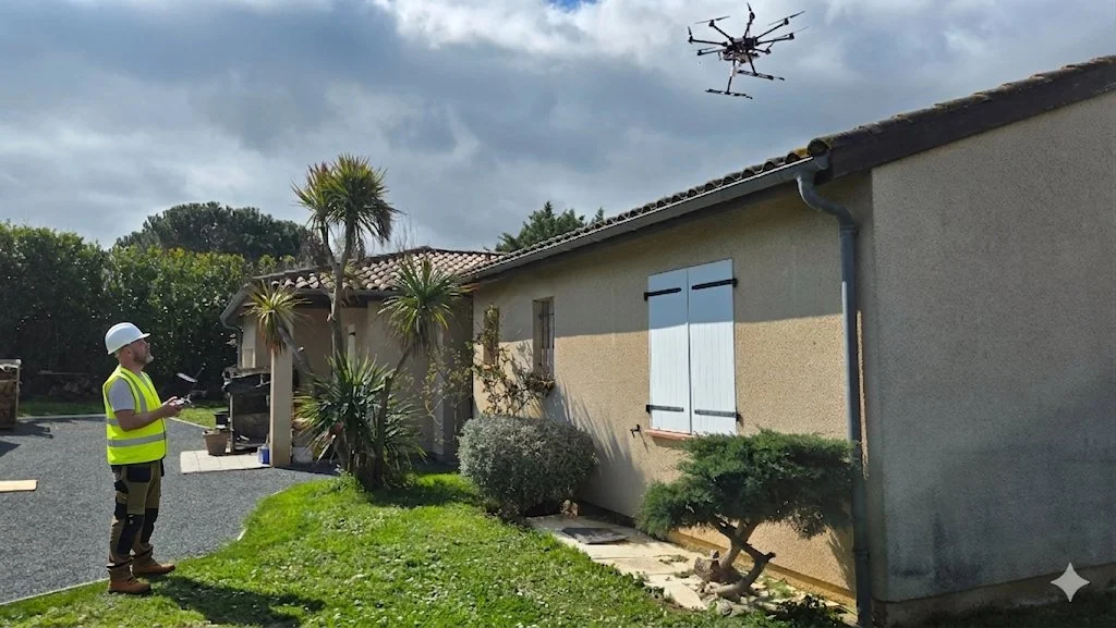 Nos interventions privilégient la pulvérisation contrôlée par drone, une méthode particulièrement adaptée aux toitures, ainsi que des techniques complémentaires pour les façades et les surfaces vitrées.