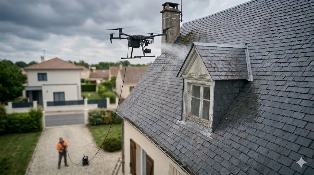 Nettoyage de toiture par drone et pulvérisation basse pression